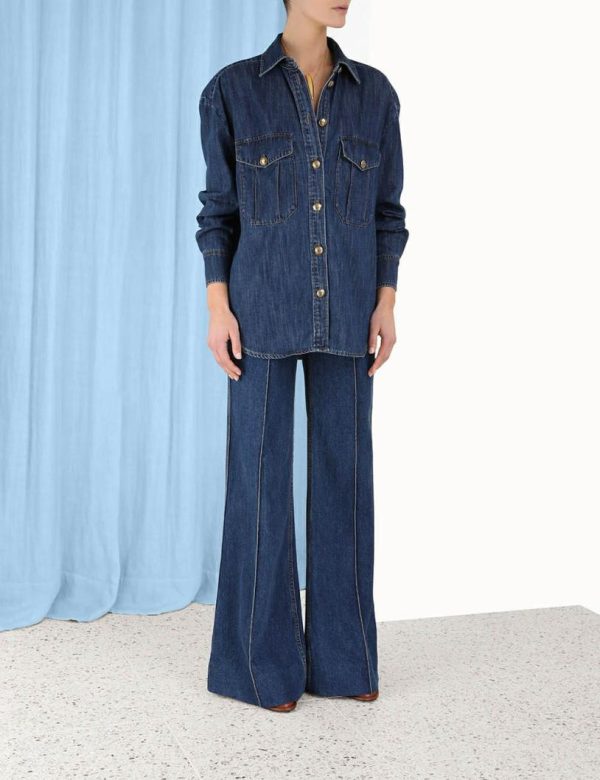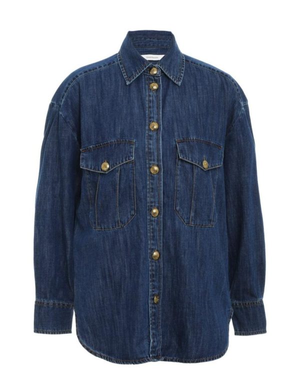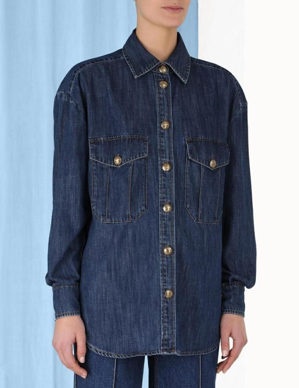 The Luminosity Denim Shirt in Sapphire from our Fall 2023 Collection, Luminosity. A denim shirt featuring a classic shirt silhouette and custom printed metal buttons throughout.