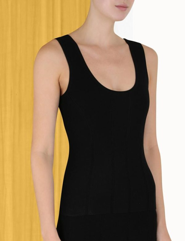 The Luminosity Knit Panelled Tank in Black from our Fall 2023 Collection, Luminosity. A knit tank featuring a pointelle stitch detail throughout.