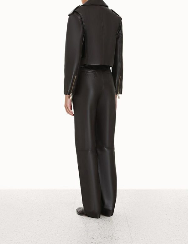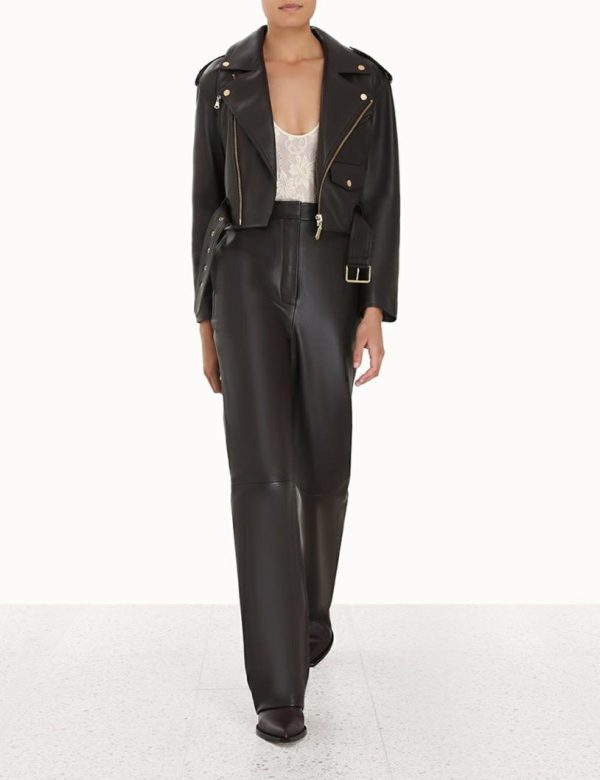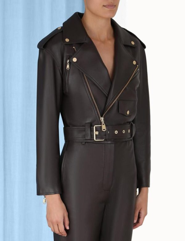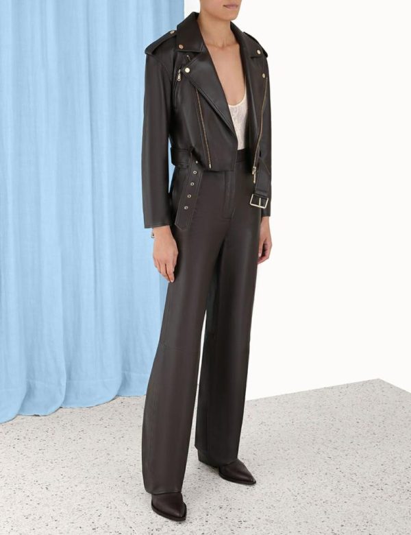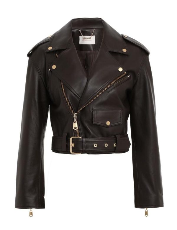 The Luminosity Leather Biker in Espresso from our Fall 2023 Collection, Luminosity. A leather jacket featuring a classic biker silhouette and gold hardware throughout.