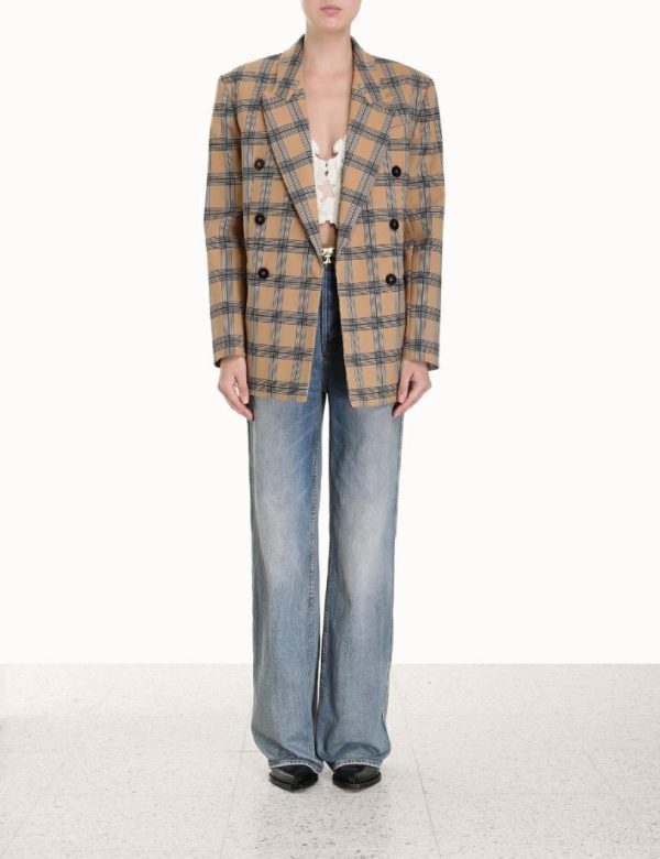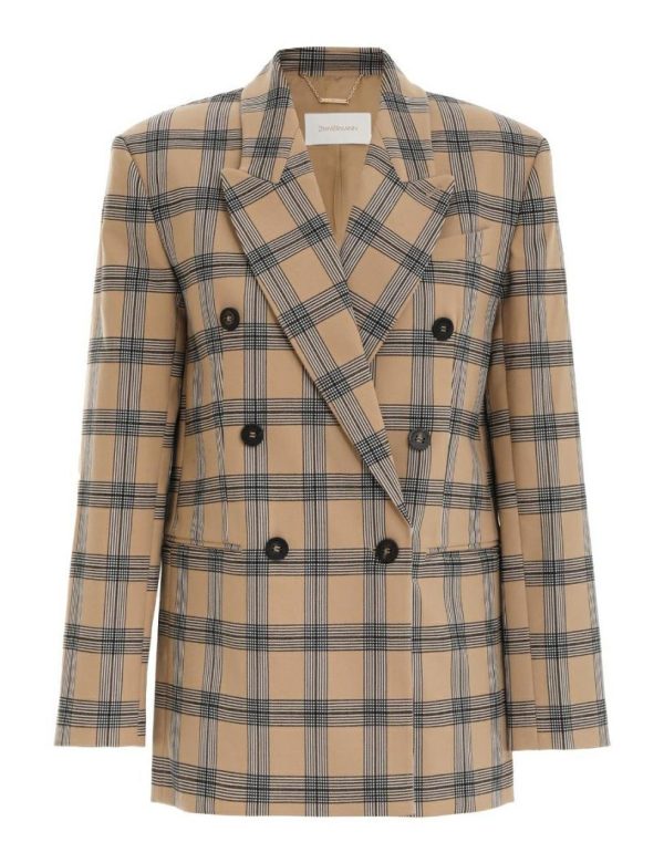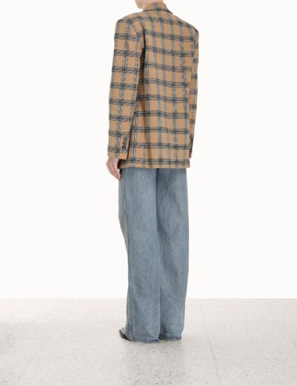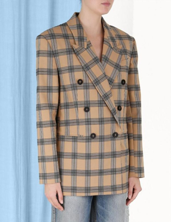 The Luminosity Oversized Jacket in Tan Check from our Fall 2023 Collection, Luminosity. A longline jacket featuring shoulder pads and a double breasted closure.
