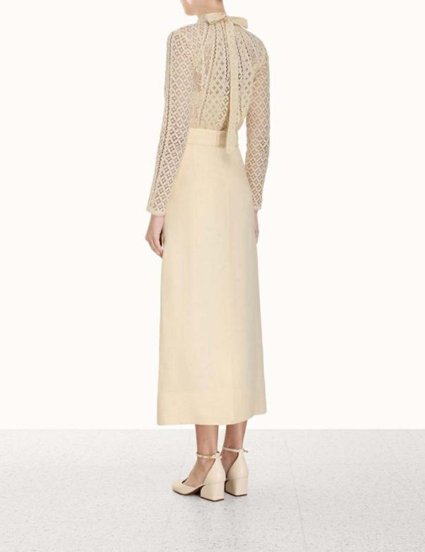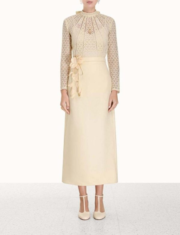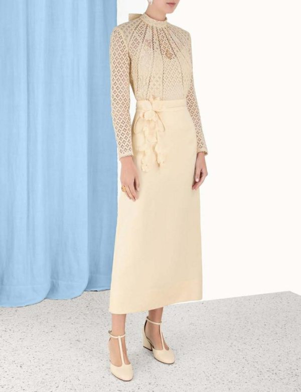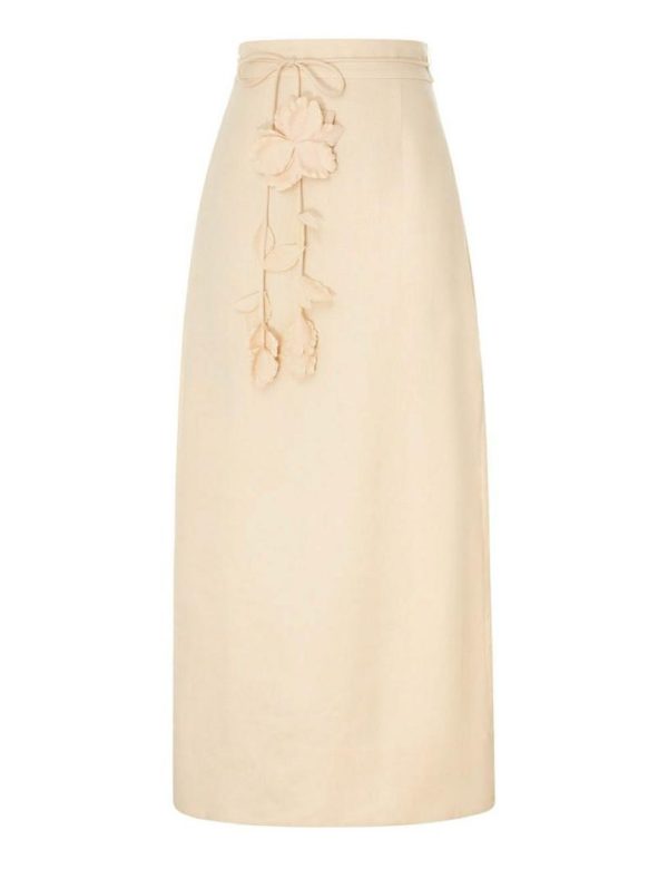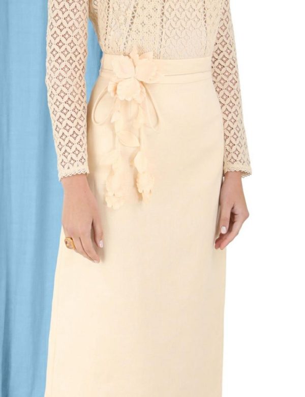 The Luminosity Pencil Skirt in Cream from our Fall 2023 Collection, Luminosity. A linen midi skirt featuring a removable floral belt.