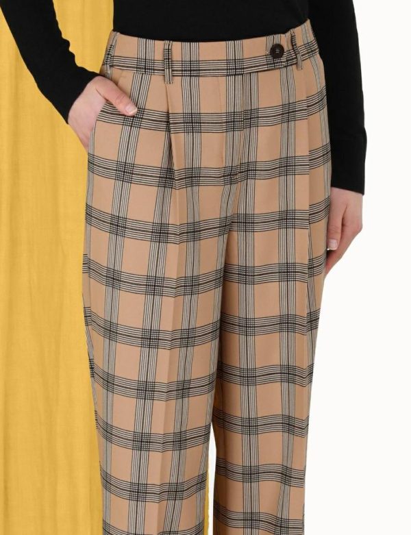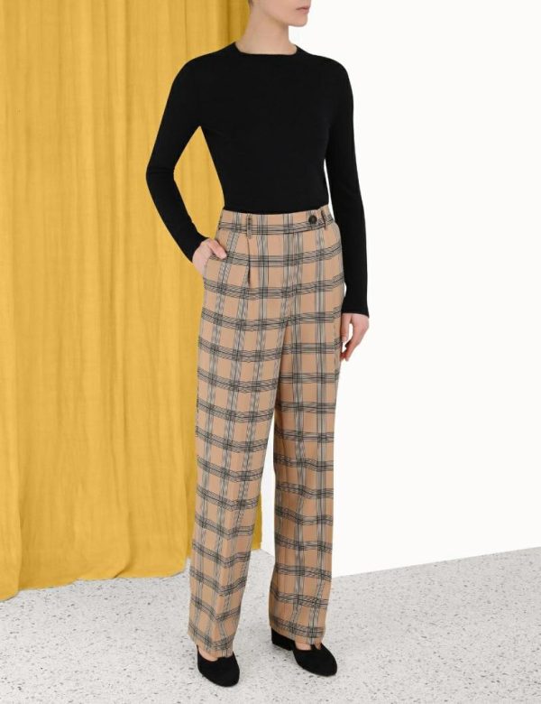 The Luminosity Pleat Front Pant in Tan Check from our Fall 2023 Collection, Luminosity. A straight leg pant featuring pleats down the centre front and side pockets.