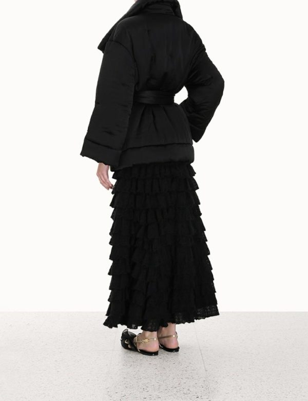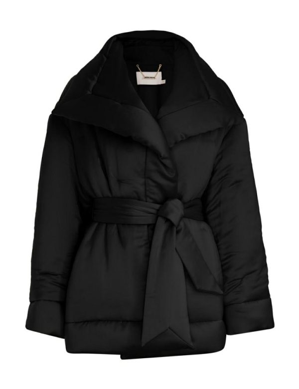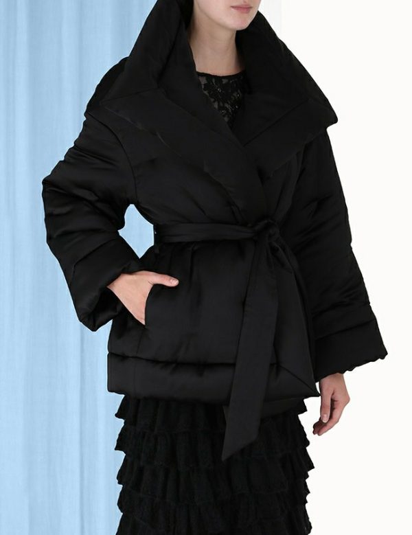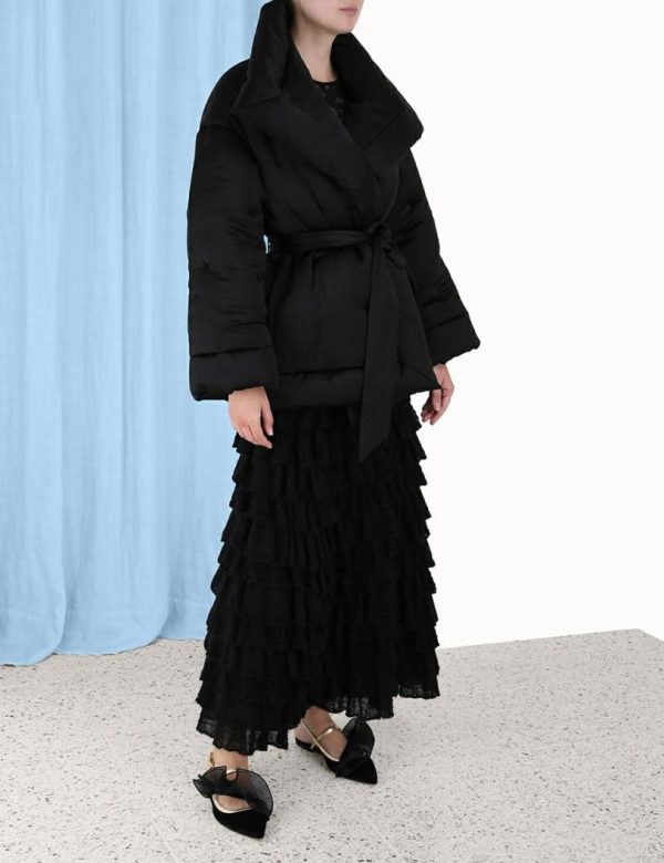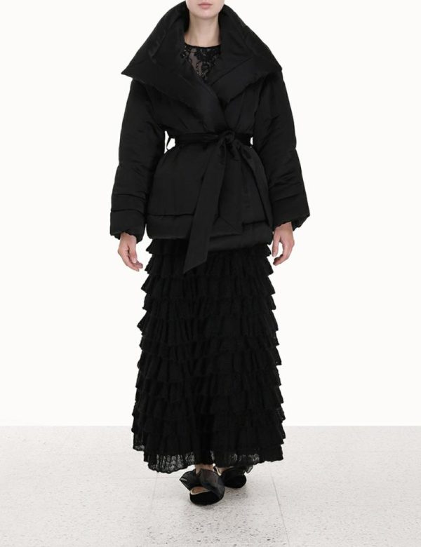 The Luminosity Satin Wadded Jacket in Black from our Fall 2023 Collection, Luminosity. A satin jacket featuring an oversized lapel and self tie waist.