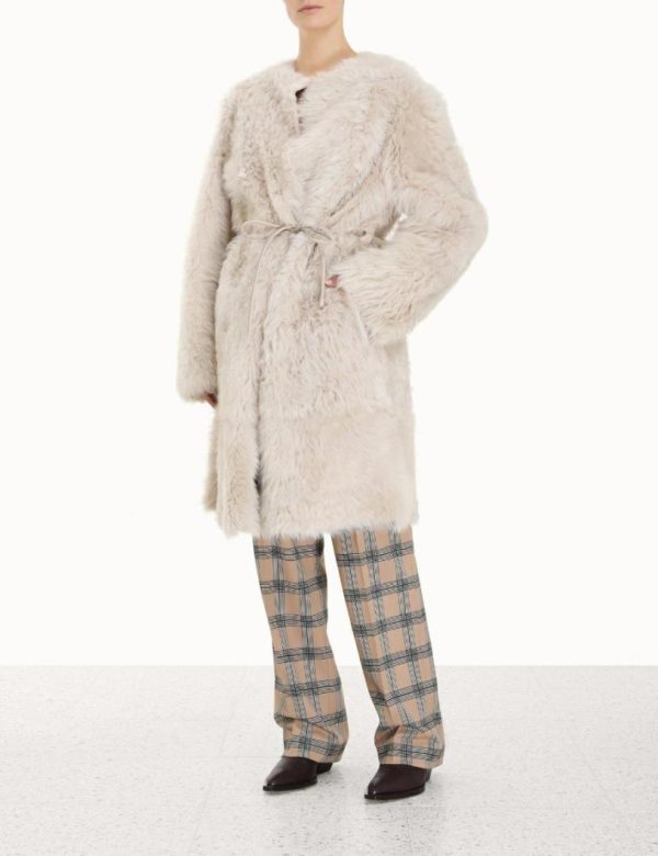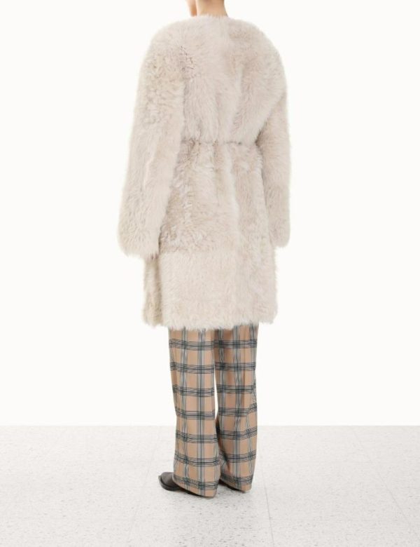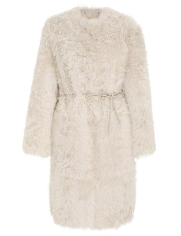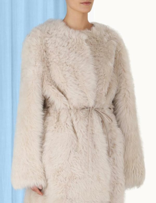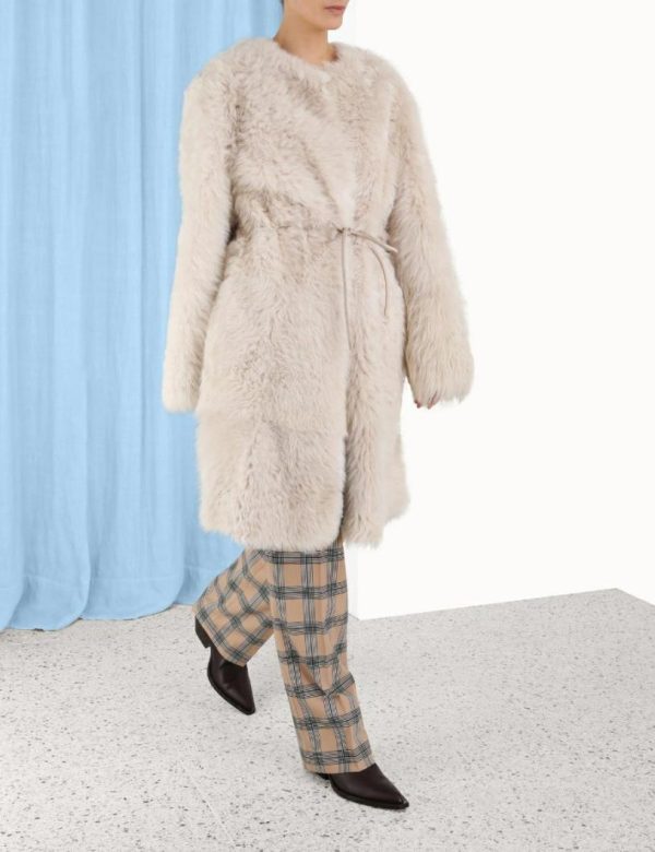 The Luminosity Shearling Coat in Bone from our Fall 2023 Collection, Luminosity. An oversized shearling coat featuring pockets throughout and a self tie tube belt .