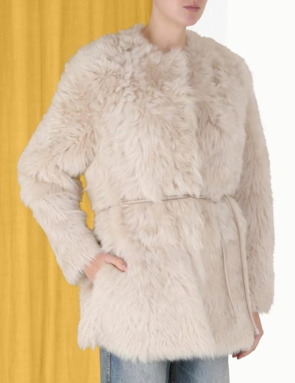 The Luminosity Shearling Jacket in Bone from our Fall 2023 Collection, Luminosity. An oversized shearling jacket featuring pockets throughout and a self tie tube belt .
