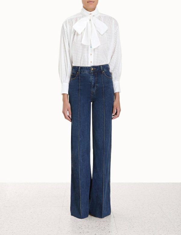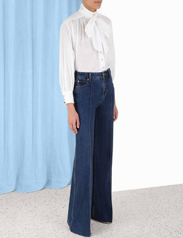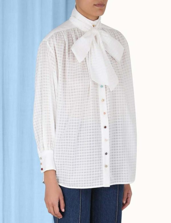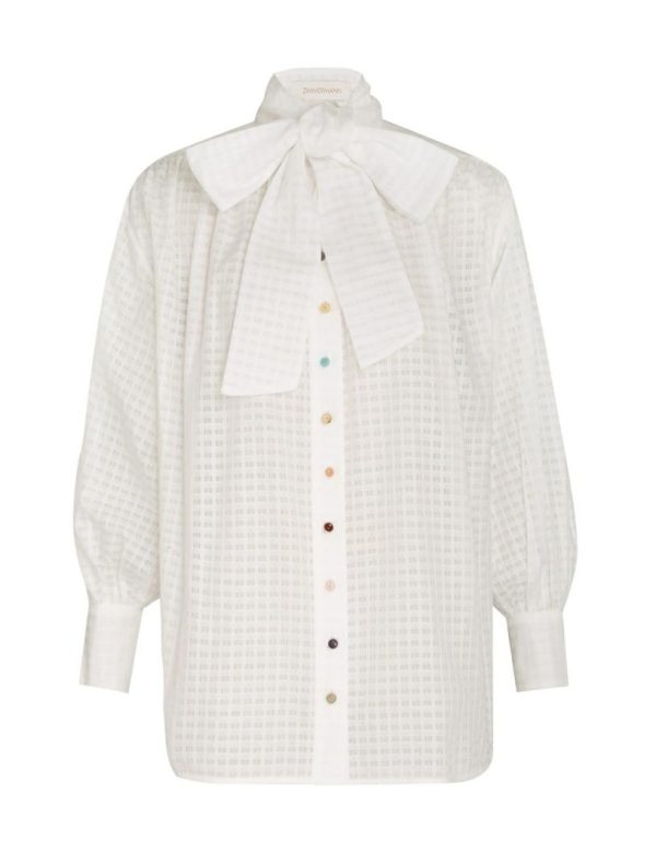 The Luminosity Tunic Blouse in Ivory from our Fall 2023 Collection, Luminosity. A cotton blouse featuring beaded buttons down the centre front and a statement neck tie.
