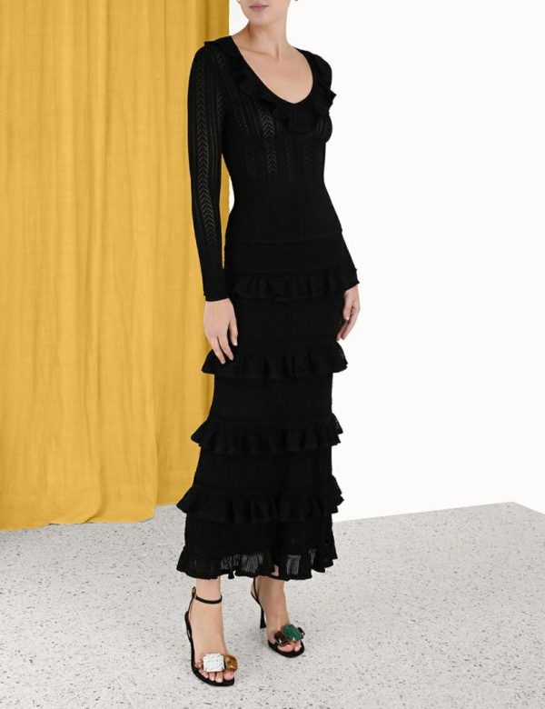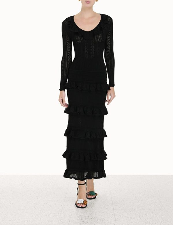 The Luminosity V-Neck Ruffle Top in Black from our Fall 2023 Collection, Luminosity. A knitted long sleeve top featuring a V neckline and ruffled detailing throughout.