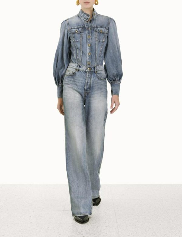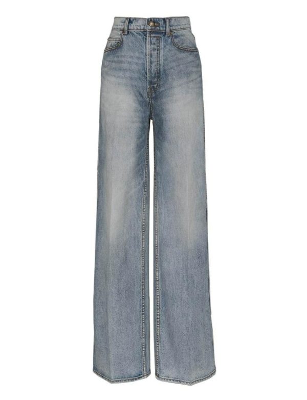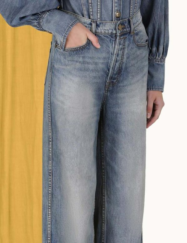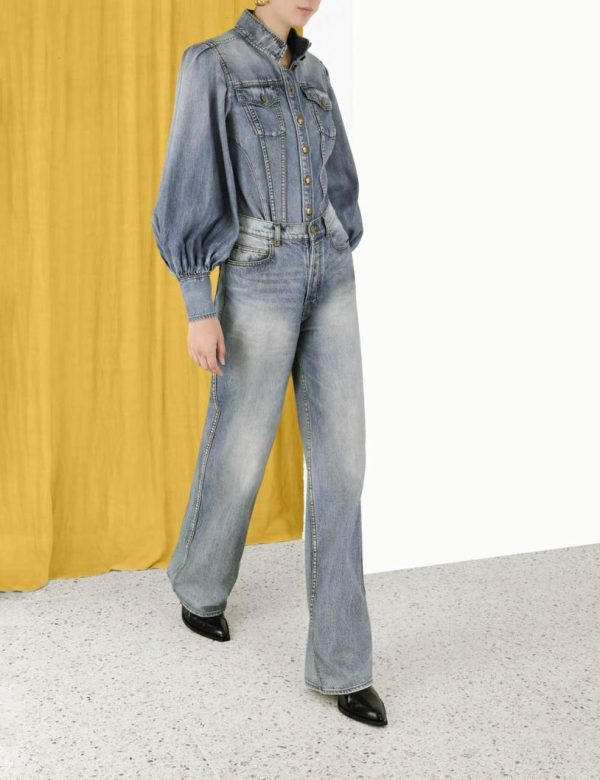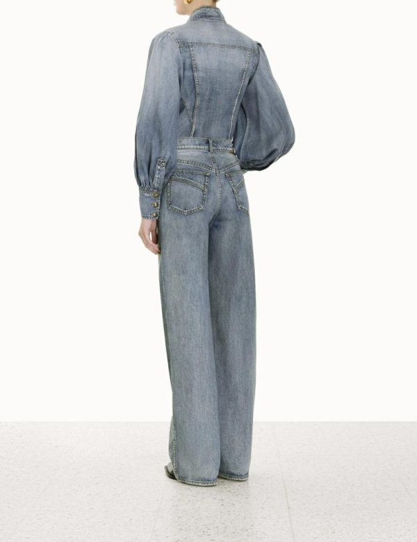 The Luminosity Wide Straight Jean in Briny Blue from our Fall 2023 Collection, Luminosity. A denim jean featuring a wide, straight leg silhouette, finished with custom branded buttons and contrast topstitching throughout.