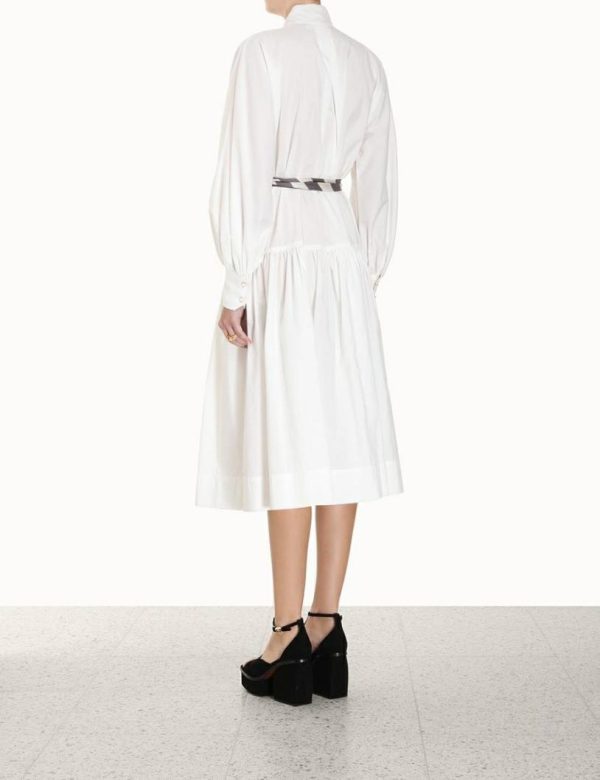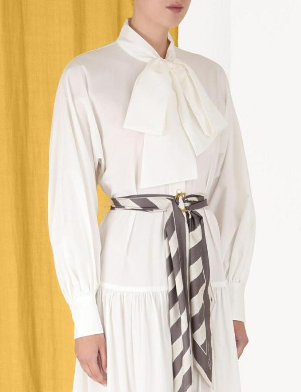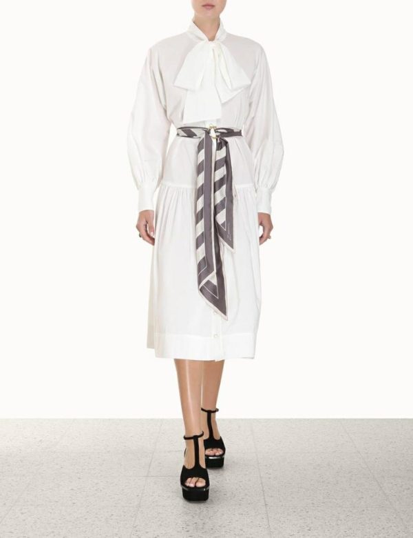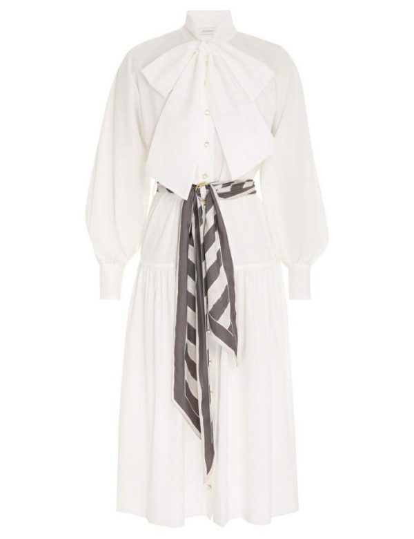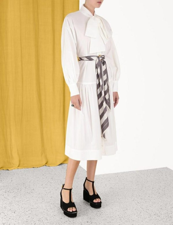 The Lyrical Scarf Tie Dress in Ivory from our Fall 2023 Collection, Luminosity. A cotton silk long sleeve midi dress featuring a scarf waist tie and an oversized neck tie.