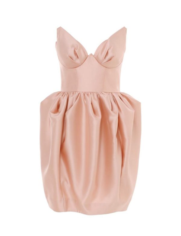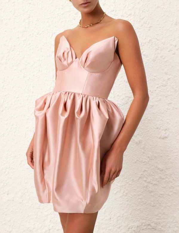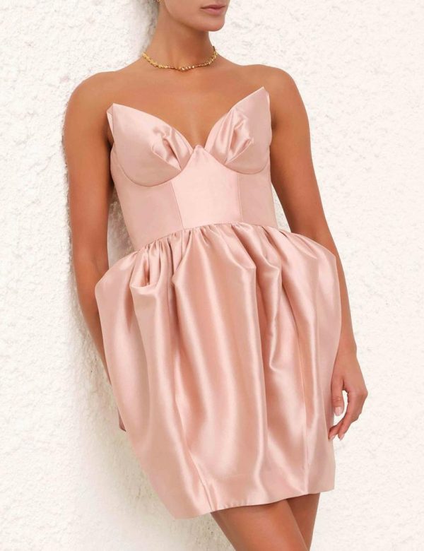 The Matchmaker Bustier Mini Dress in Pink from our Resort 2024 Collection, Matchmaker. A silk wool mini dress featuring a structured bodice with boning.