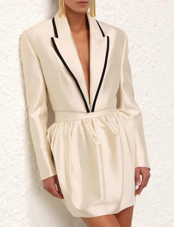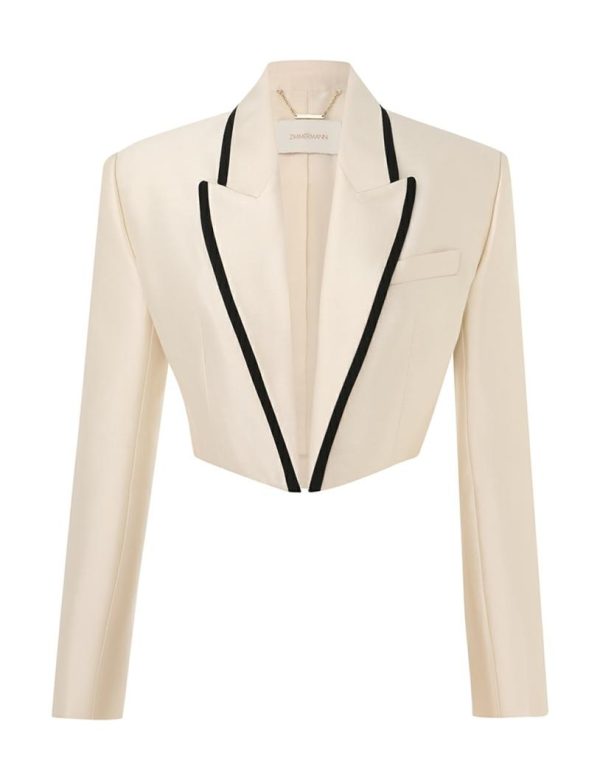 The Matchmaker Tuxedo Jacket in Cream from our Resort 2024 Collection, Matchmaker. A wool and silk blend jacket featuring a contrast trim and cropped silhouette.