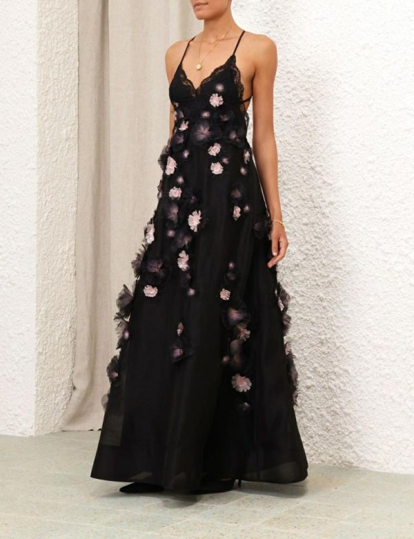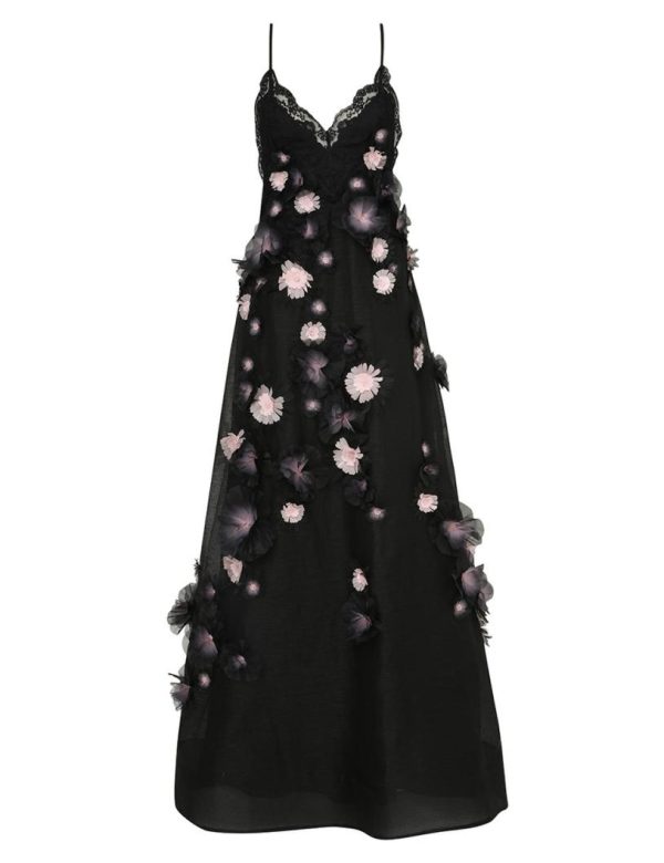 The Matchmaker Daisy Slip Dress in Black/Pink from our Resort 2024 Collection, Matchmaker. A silk linen organza slip dress featuring lace trims and laser cut daisy crystal flowers.