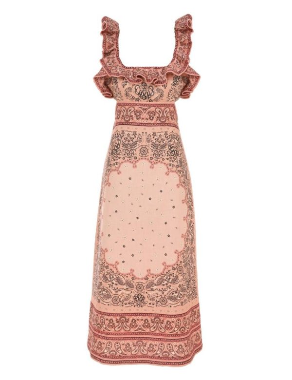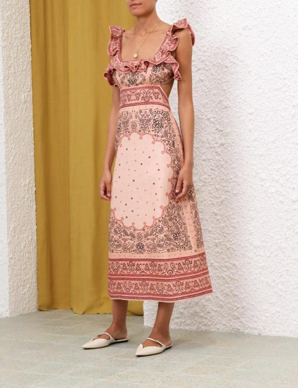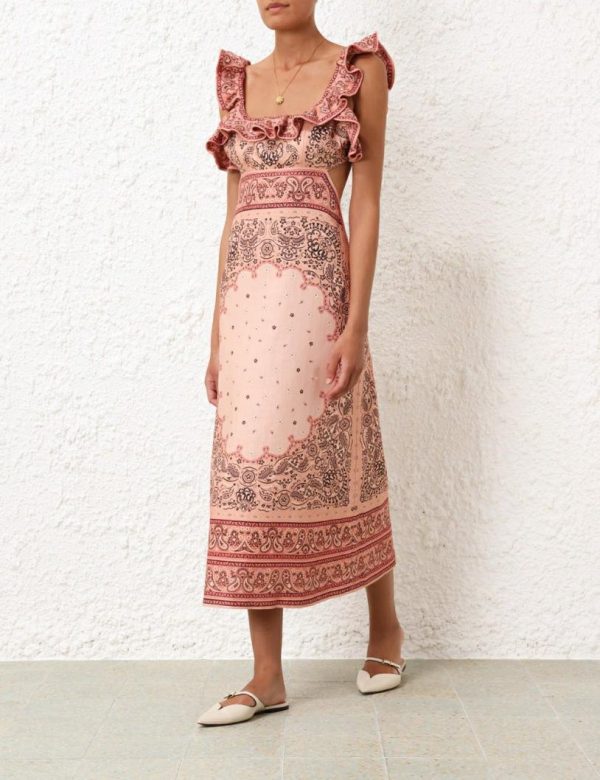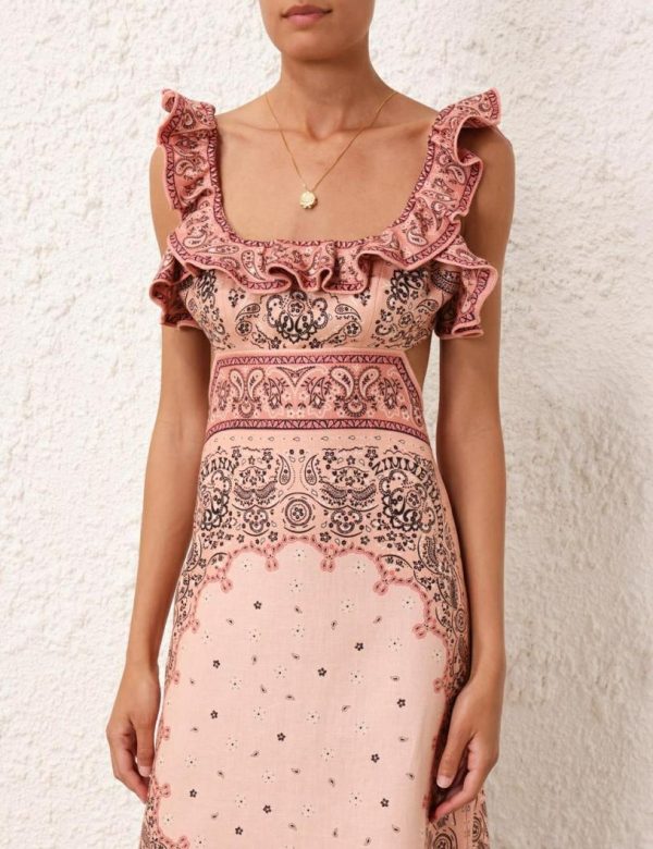The Matchmaker Frilled Midi in Pink Bandana from our Resort 2024 Collection, Matchmaker. A linen midi dress featuring a square frilled neckline and frill straps, finished with a cutaway back and self tie closure.