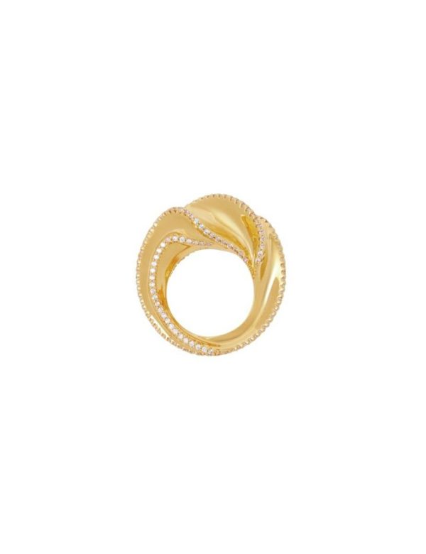 The Paint Stroke Ring in Gold from our Fall 2023 Collection, Luminosity. A gold plated ring featuring a twist look detail and cubic zirconia stones throughout.