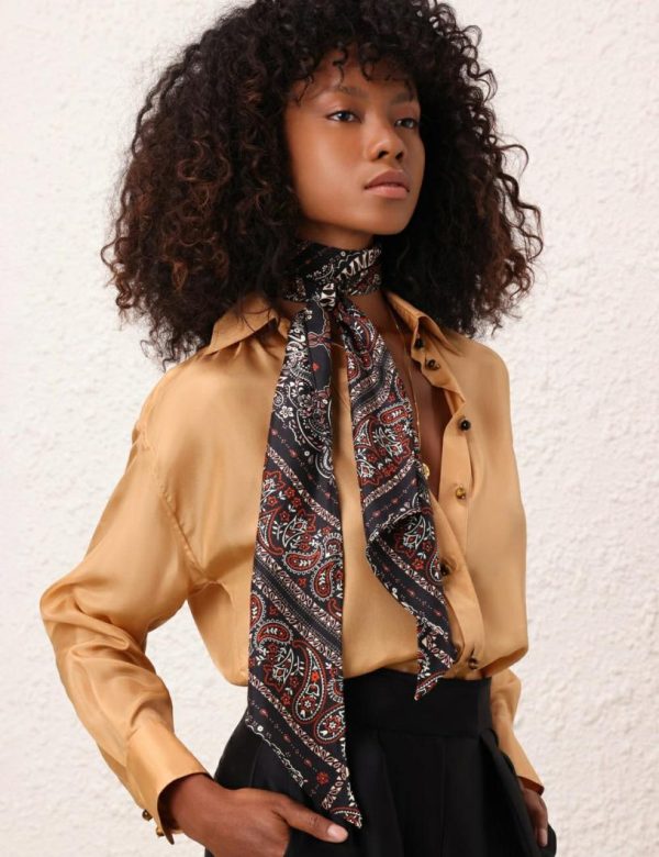 The Printed Silk Neck Scarf in Black Bandana from our Resort 2024 Collection, Matchmaker. A silk neck scarf featuring a customised placement print and fine rolled hem.