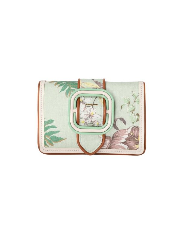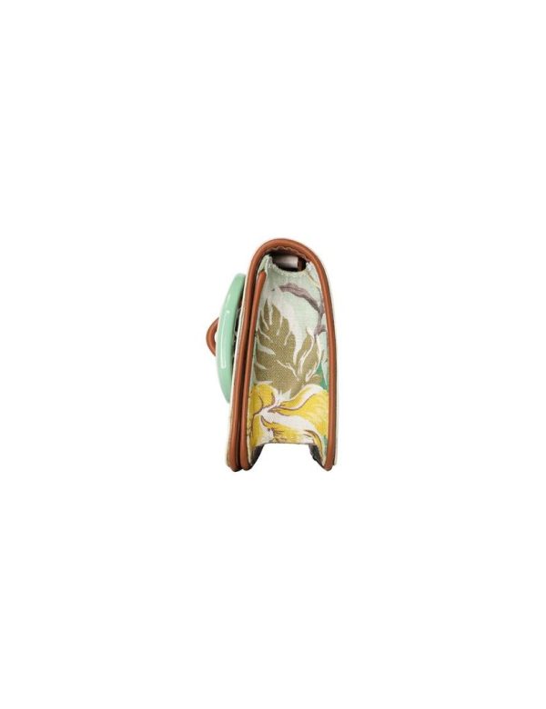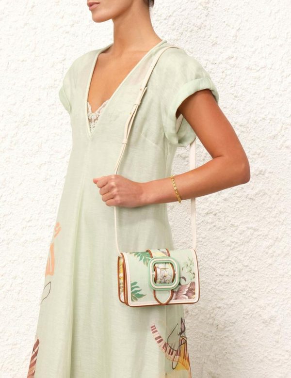 The Printed Small Cross Body Bag in Mint Tropical Floral from our Resort 2024 Collection, Matchmaker. A small linen cross body bag featuring a buckle front design and an internal card pocket.