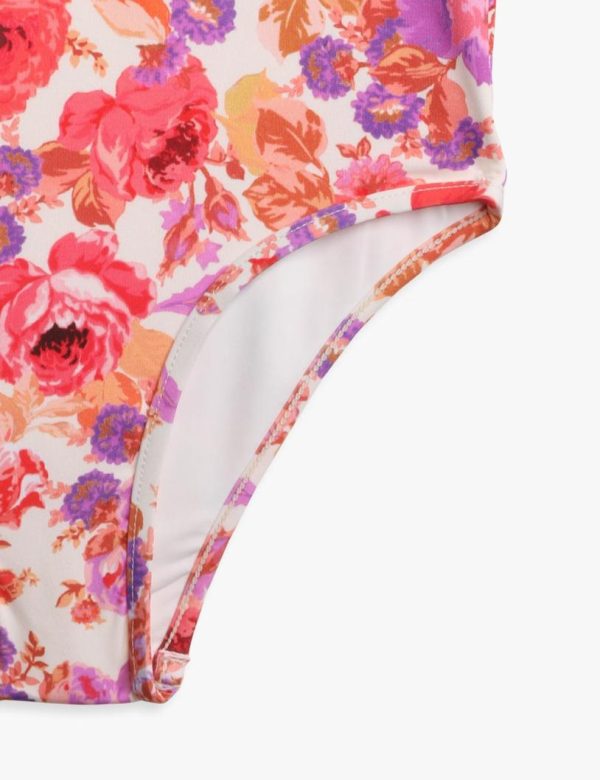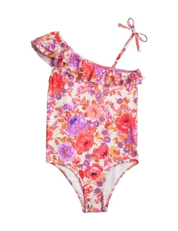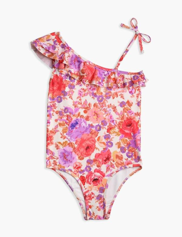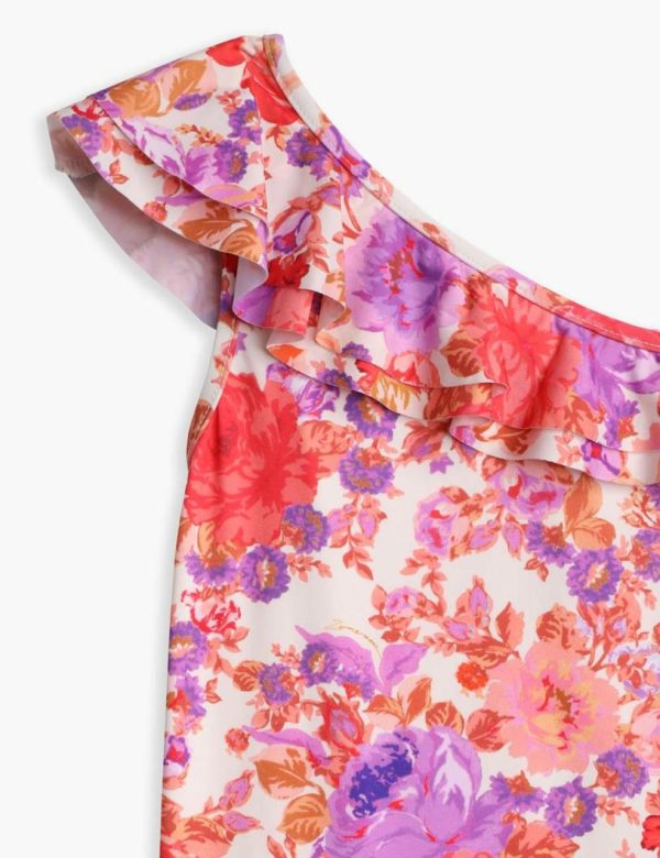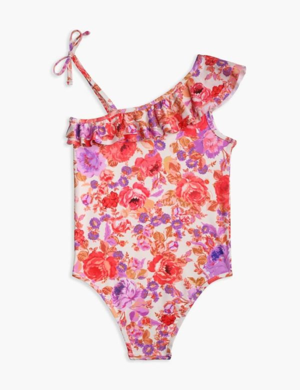 The Raie Frill 1 Shoulder 1PC in Red/Purple Floral from our Summer Swim 2023 Collection. An Italian lycra one piece with an asymmetric frilled neckline and spaghetti shoulder strap.