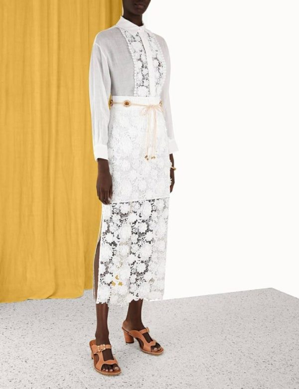 The Raie Lace Flower Shirt in Ivory from our Summer Swim 2023 Collection. A ramie long sleeve shirt featuring a 3D flower insert lace trim.