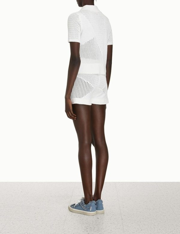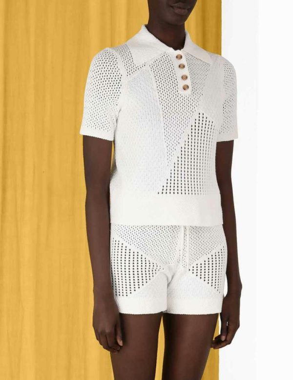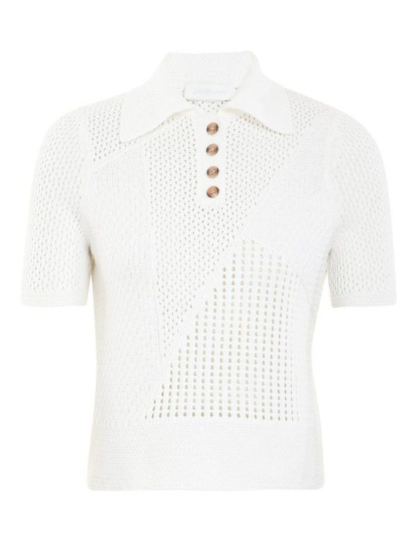 The Raie Mesh Knit Polo in White from our Summer Swim 2023 Collection. A cotton polo top featuring a classic collar and short sleeves.