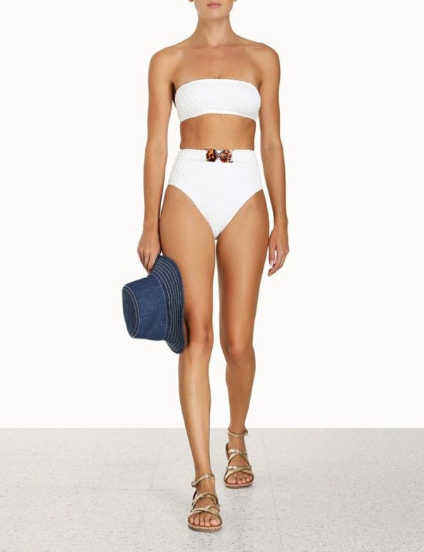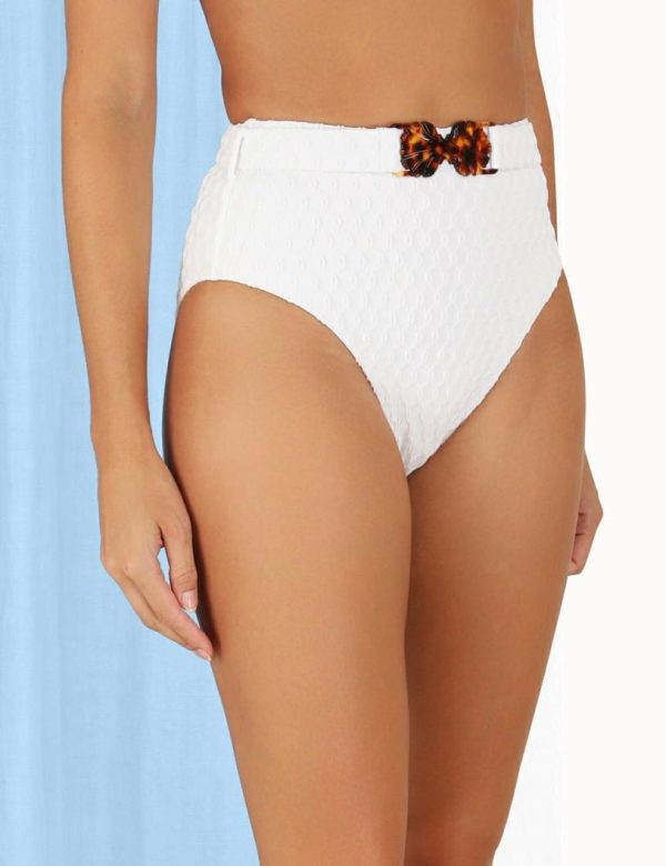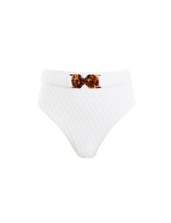 The Raie Texture Belted HW Pant in Ivory from our Summer Swim 2023 Collection. A textured lycra pant featuring a removable belt.
