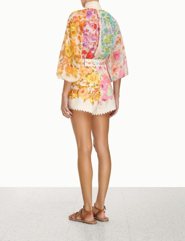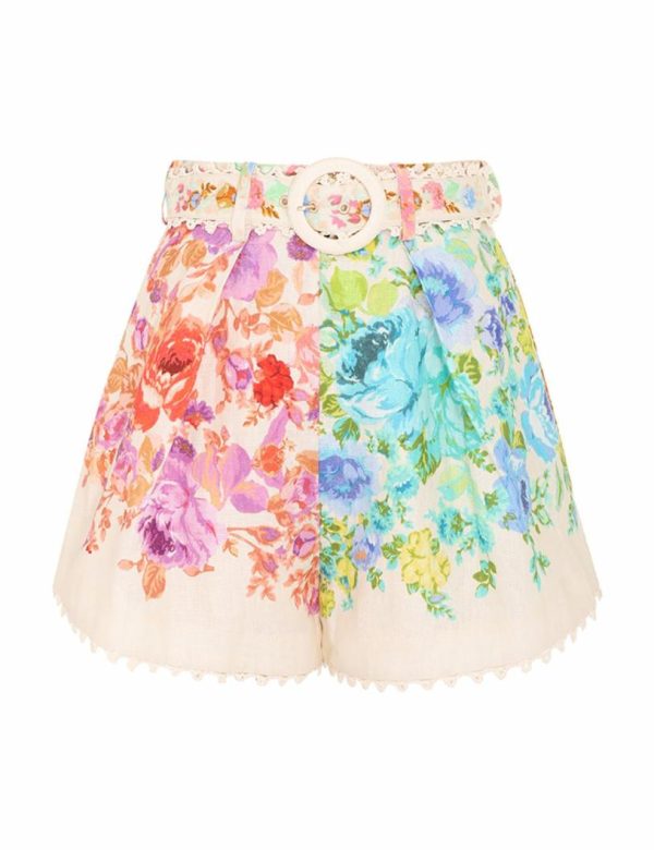 The Raie Tuck Short in Multi Floral from our Summer Swim 2023 Collection. A high waisted linen short featuring a floral placement print throughout and raffia trims along the edges.