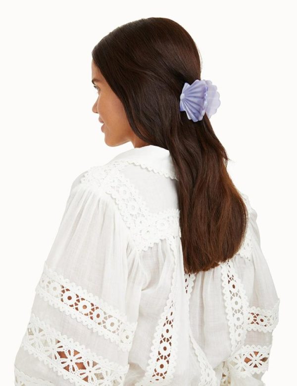 The Shell Clasp in Lilac from our Summer Swim 2023 Collection. A large shell hair clasp featuring gold hardware and customised Zimmermann branding.