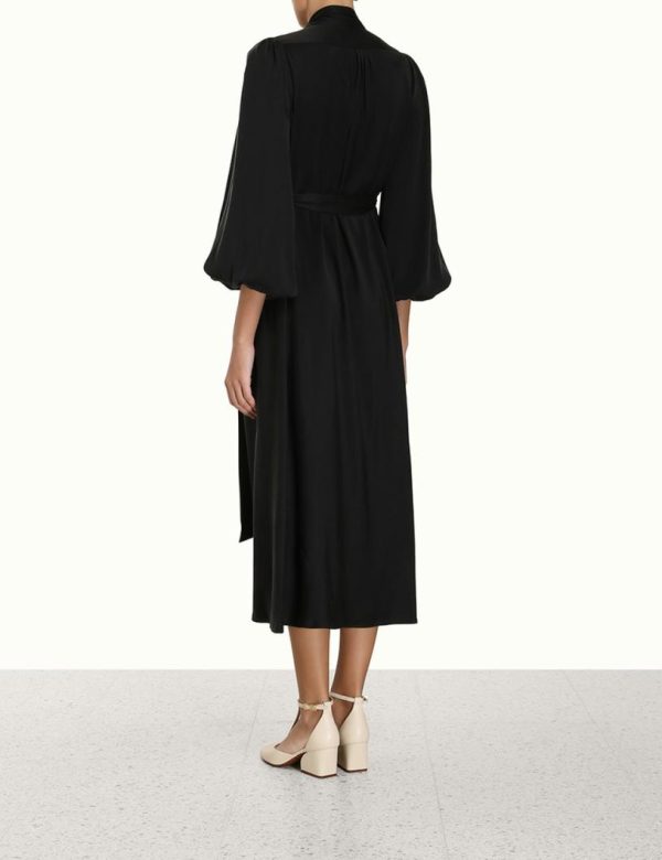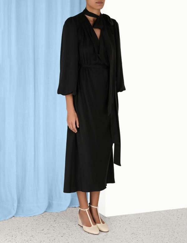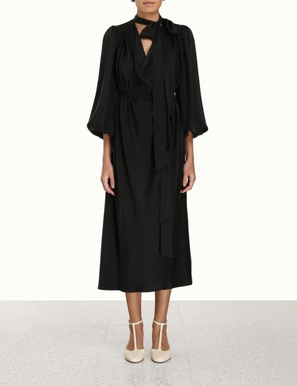 The Silk Billow Dress in Black from our Fall 2023 Collection, Luminosity. A silk long sleeve midi dress featuring a cowl neck, a necktie, and a removable self tie belt.