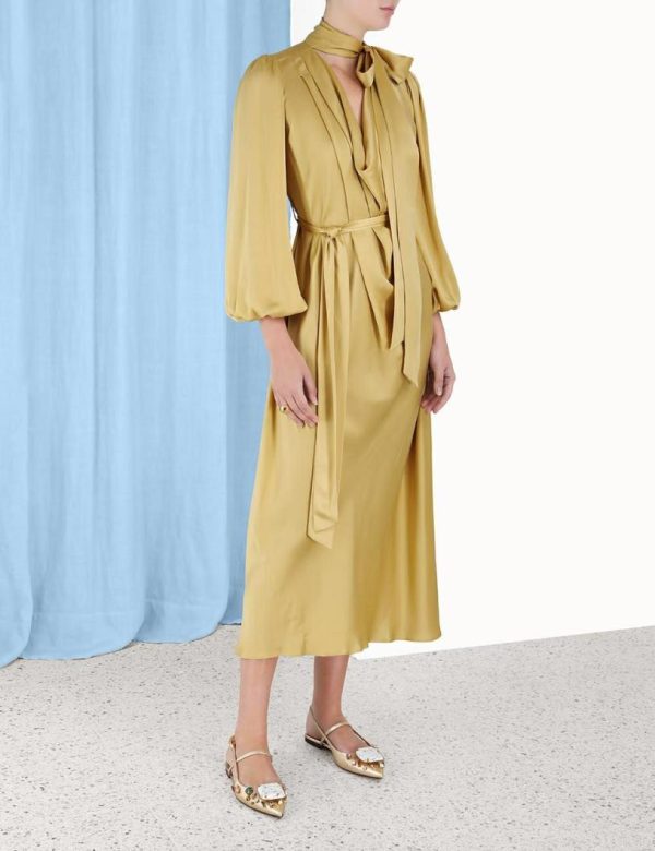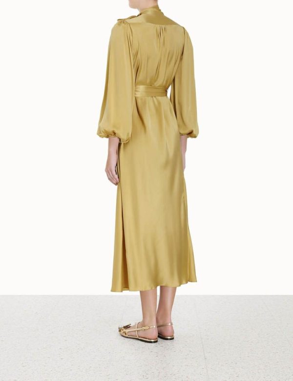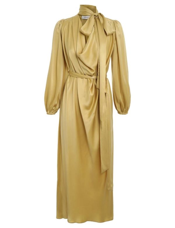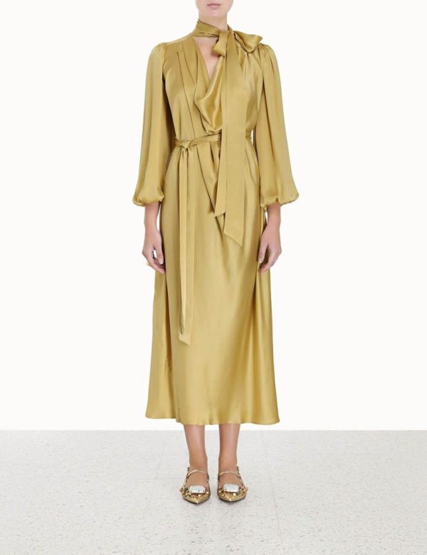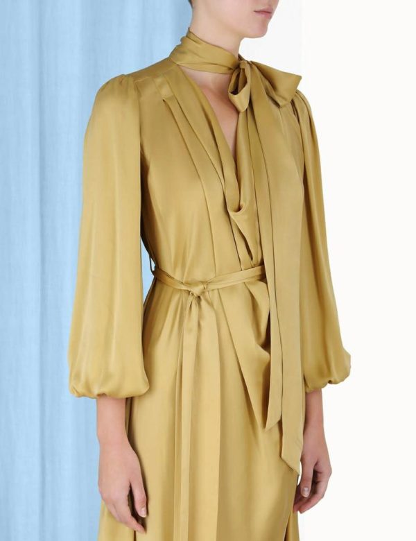 The Silk Billow Dress in Mustard from our Fall 2023 Collection, Luminosity. A silk long sleeve midi dress featuring a cowl neck, a necktie, and a removable self tie belt.