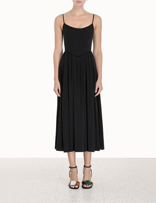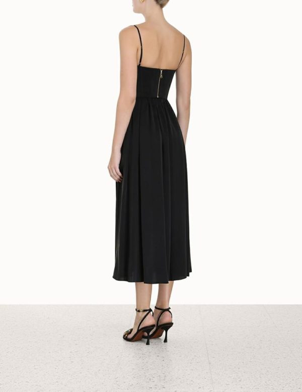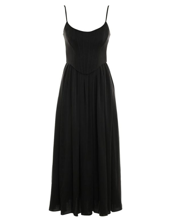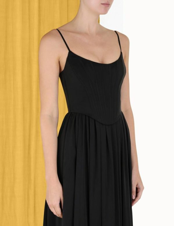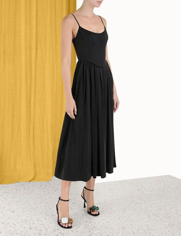 The Silk Corset Dress in Black from our Fall 2023 Collection, Luminosity. A silk midi dress featuring a structured bodice with boning and adjustable straps.