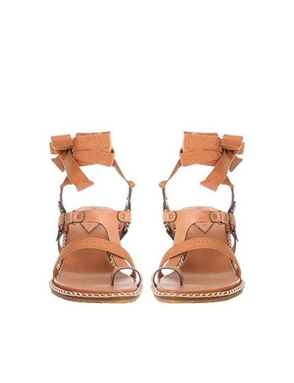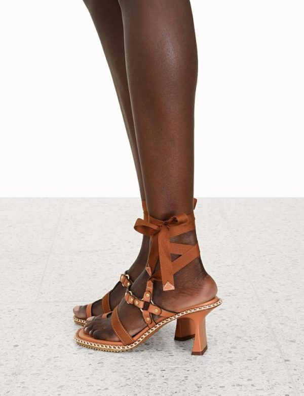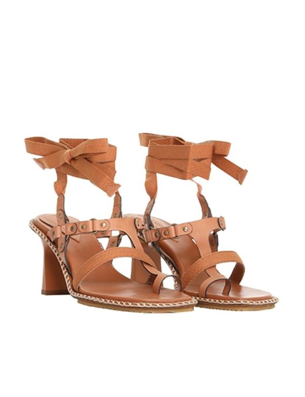 The Toe Thong Bow Sandal 65 in Tan from our Summer Swim 2023 Collection. A leather heeled sandal featuring a lace up ankle and gold hardware throughout.