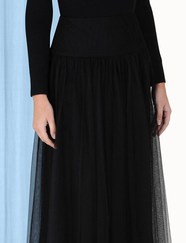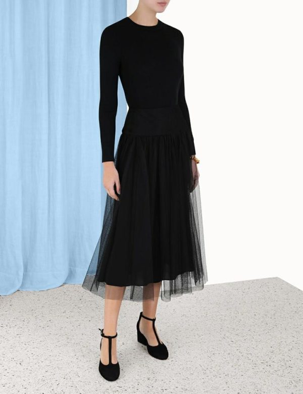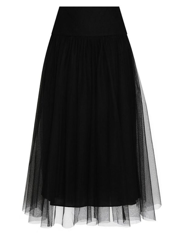 The Tulle Skirt in Black from our Fall 2023 Collection, Luminosity. A tulle midi skirt featuring a basque waist and raw hem.