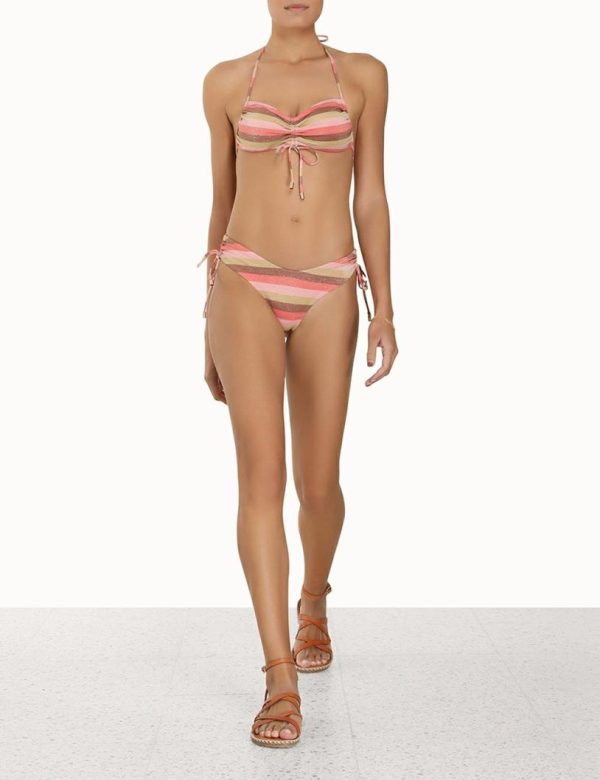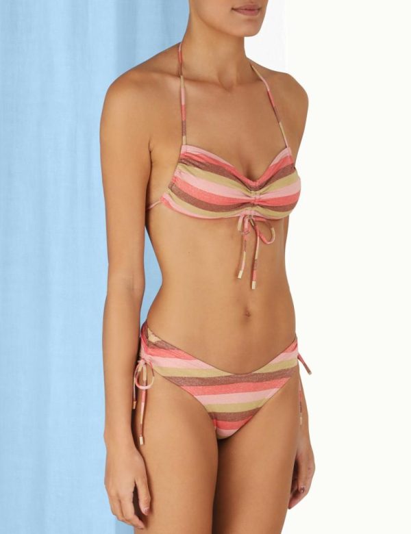The Vacay Lurex Ruched Side Bikini in Lurex Multi Stripe from our Summer Swim 2023 Collection. A halter neck bandeau top and V shaped pants with adjustable ruched details throughout.