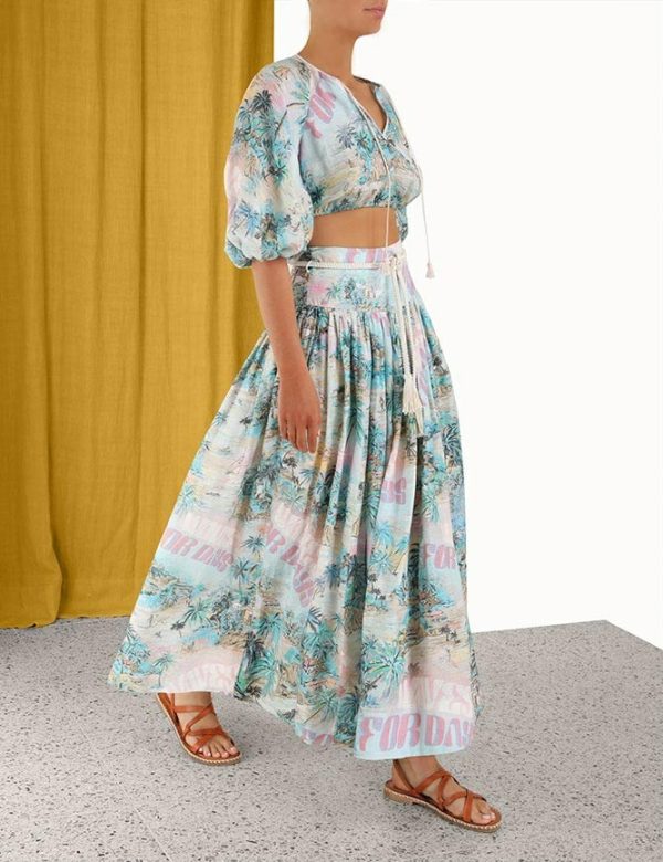 The Vacay Midi Skirt in Blue Multi from our Summer Swim 2023 Collection. A linen midi skirt featuring a basque waist and rope belt with fringed tassel ends.