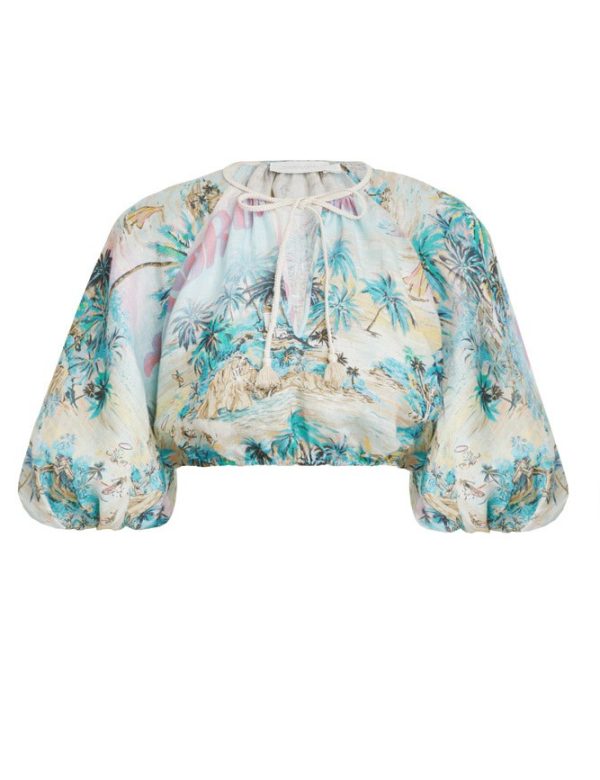 The Vacay Puff Sleeve Crop Top in Blue Multi from our Summer Swim 2023 Collection. A linen crop top featuring short puff sleeves and a self tie neck.