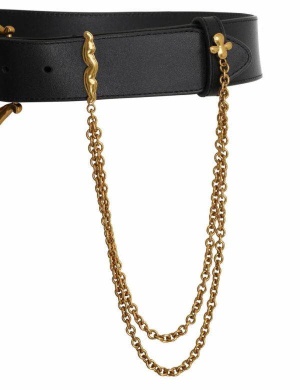 The Western Waist Belt in Black from our Fall 2023 Collection, Luminosity. A leather waist belt featuring a western look buckle and a draped chain.