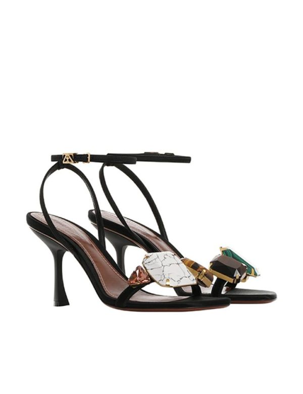 The Zimmermann Phantasy Sandals 85 in Black from our Fall 2023 Collection, Luminosity. A silk satin heel featuring assorted jewels throughout.