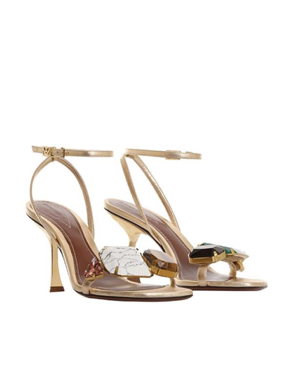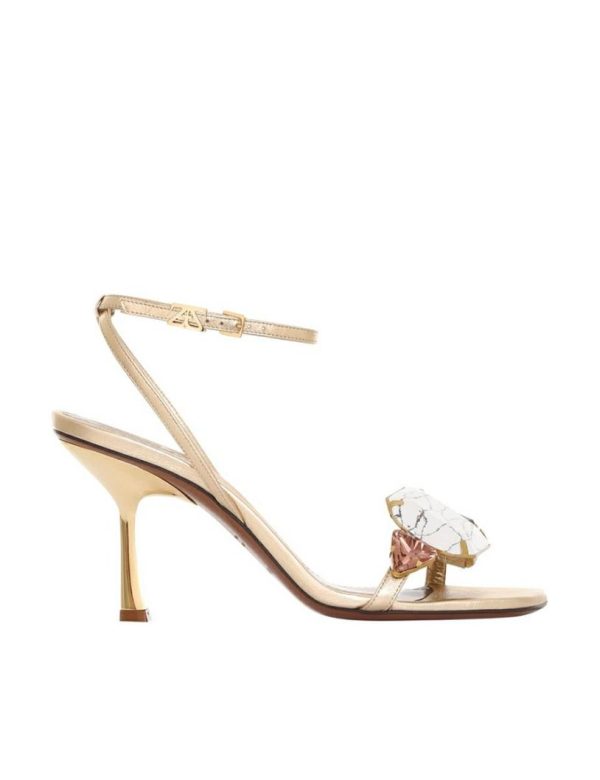 The Zimmermann Phantasy Sandals 85 in Gold from our Fall 2023 Collection, Luminosity. A metallic leather heel featuring assorted jewel embellishments throughout.